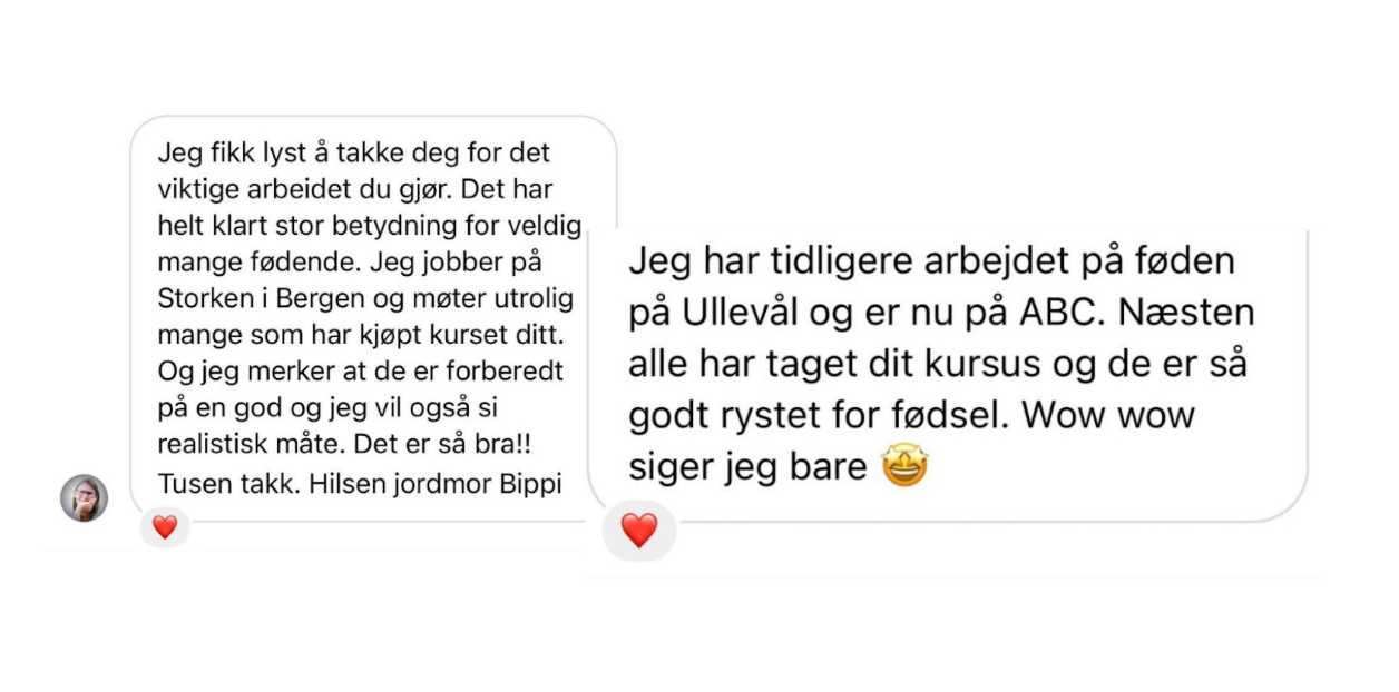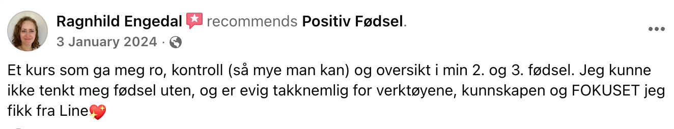 "Jeg anbefaler Positiv Fødsel til alle gravide! Jeg tok kurset da jeg skulle få min andre baby etter katastrofesnitt med første. Bare tanken på å skulle føde igjen ga meg angst. Samtidig hadde jeg en drøm om å føde vaginalt og virkelig få oppleve fødselen min, med trygghet.